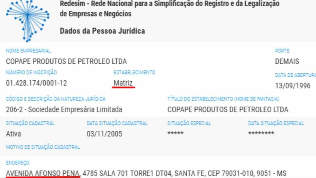 Apesar de as operações da Copape se concentrarem em Guarulhos, o cadastro do CNPJ na Receita Federal revela que a sede fica em edifício em Campo Grande, sendo a unidade de SP uma filial.